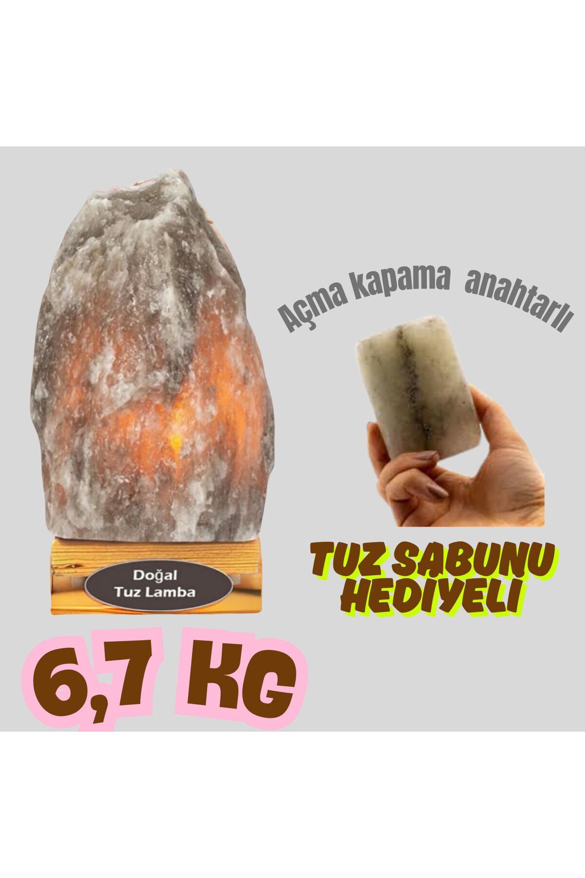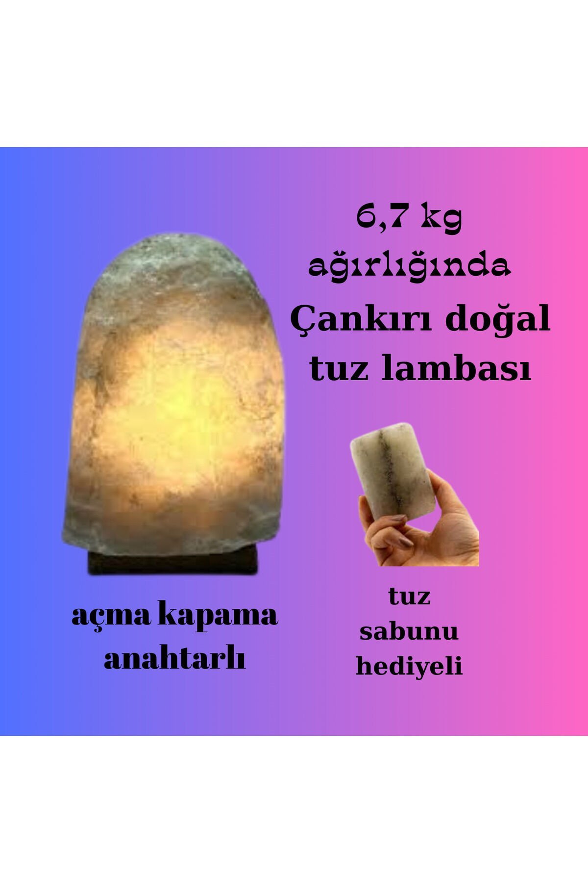 Doğal Çankırı kaya tuzundan üretilmiş, masanızın üzerinde şık bir aksesuar olarak kullanabileceğiniz lamba E14 duy tipine sahip, standart ampullerle uyumlu ve kolayca değiştirilebilir aydınlatma sistemi; ACMA KAPAMALİ Kablolu tasarımı sayesinde güvenilir ve sürekli bir enerji akışı sağlar, böylece kesintisiz bir aydınlatma deneyimi sunar; Elektrikle çalışan yapısı ile enerji verimliliği ve uzun ömürlü kullanım vaat eder; Masa üstü kullanım için ideal boyutlarda olan bu lamba, çalışma alanınızda veya oturma odanızda estetik bir dokunuş katar;